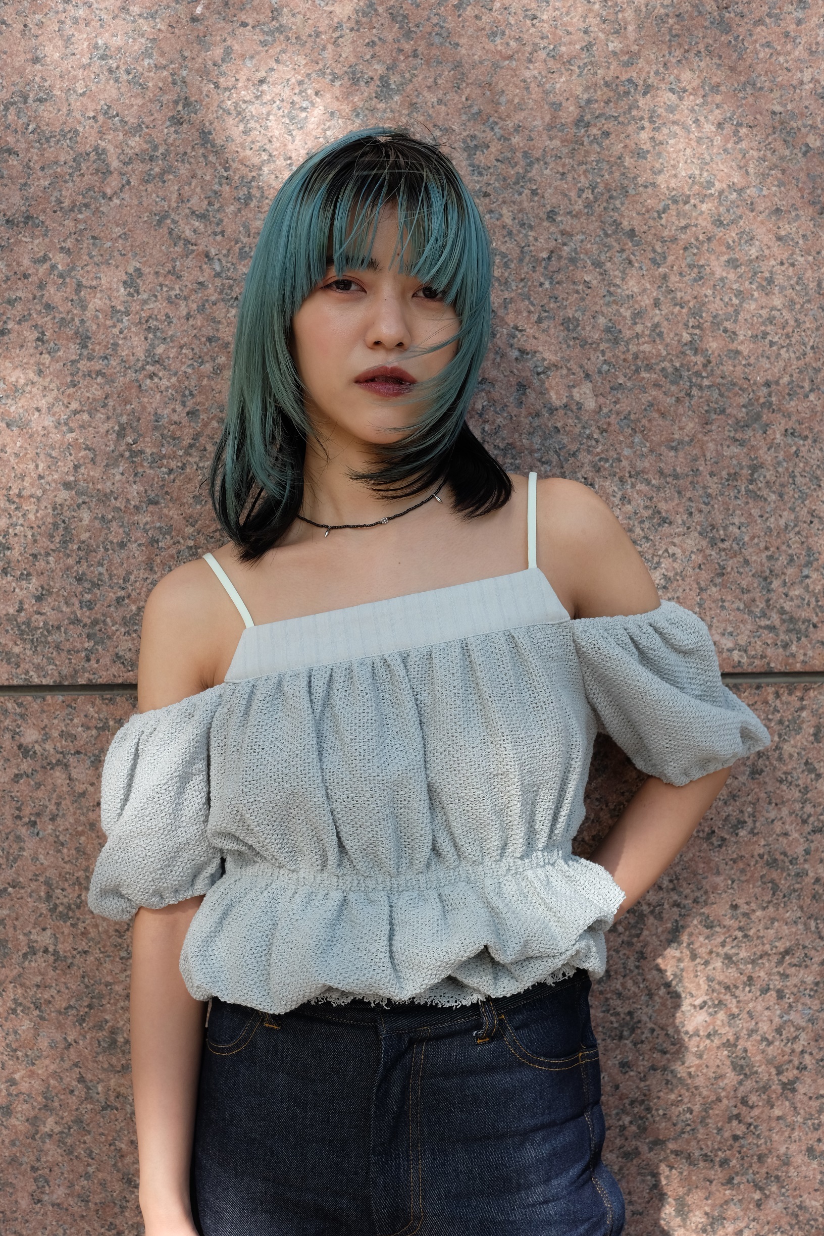 > ストラップショルダーブラウス