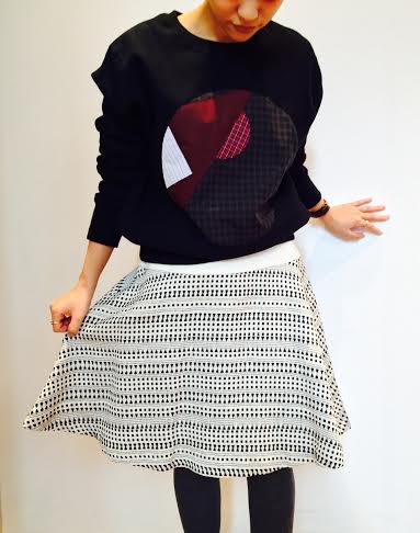 胸元にはさまざまな裁ち切りの生地を組み合わせたパッチワークが施されており