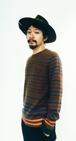 茶色のニットに、ブルーとオレンジ、グリーンの太さのまばらなライン。