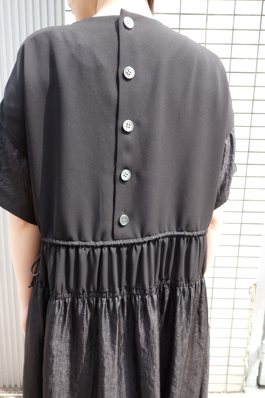 袖とスカートには光沢のあるツイル生地が使われており華やかな一面も。