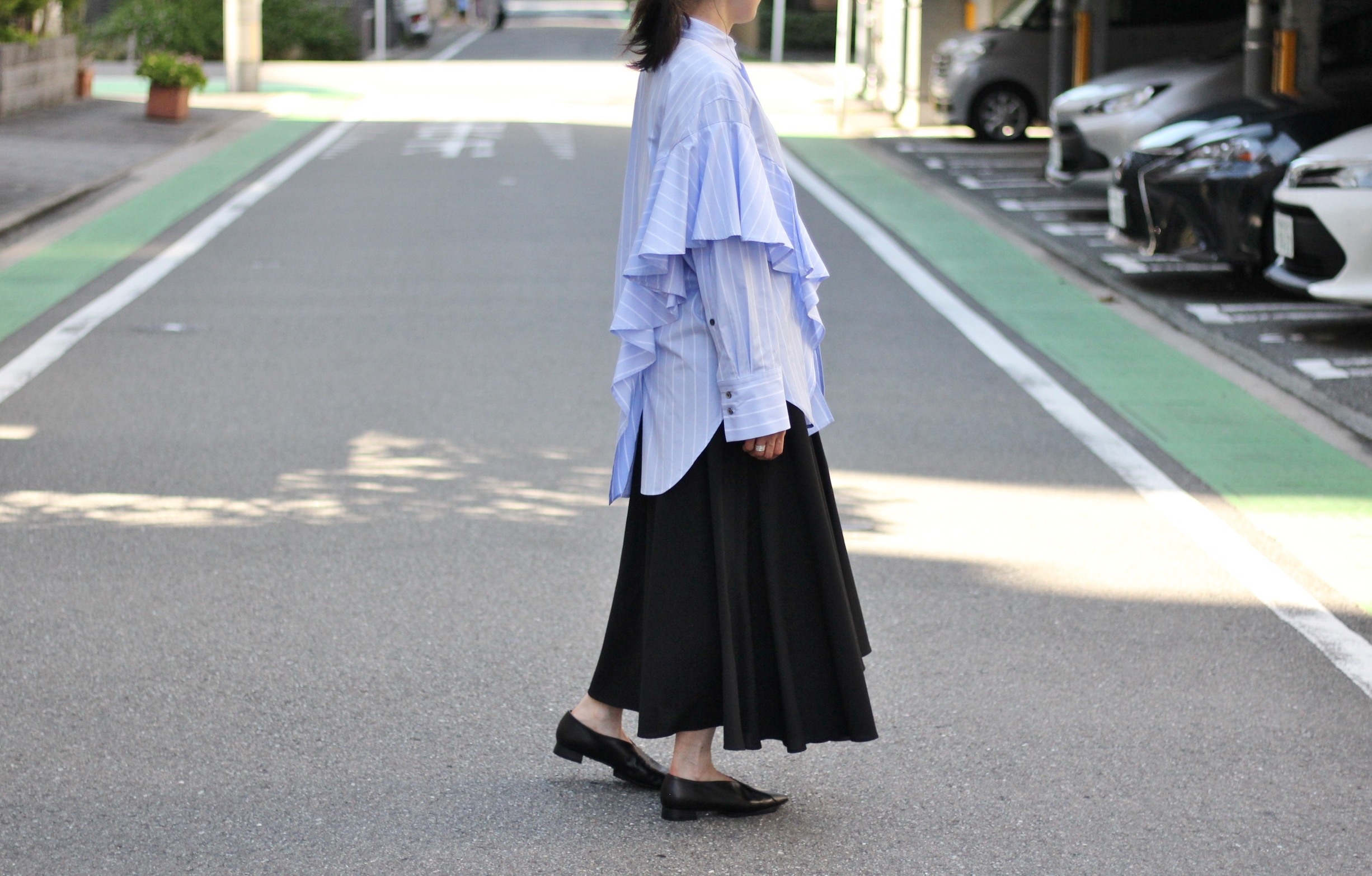 一緒に履いていたのは、アシンメトリーな着流れが柔らかで女性らしいフレアスカート