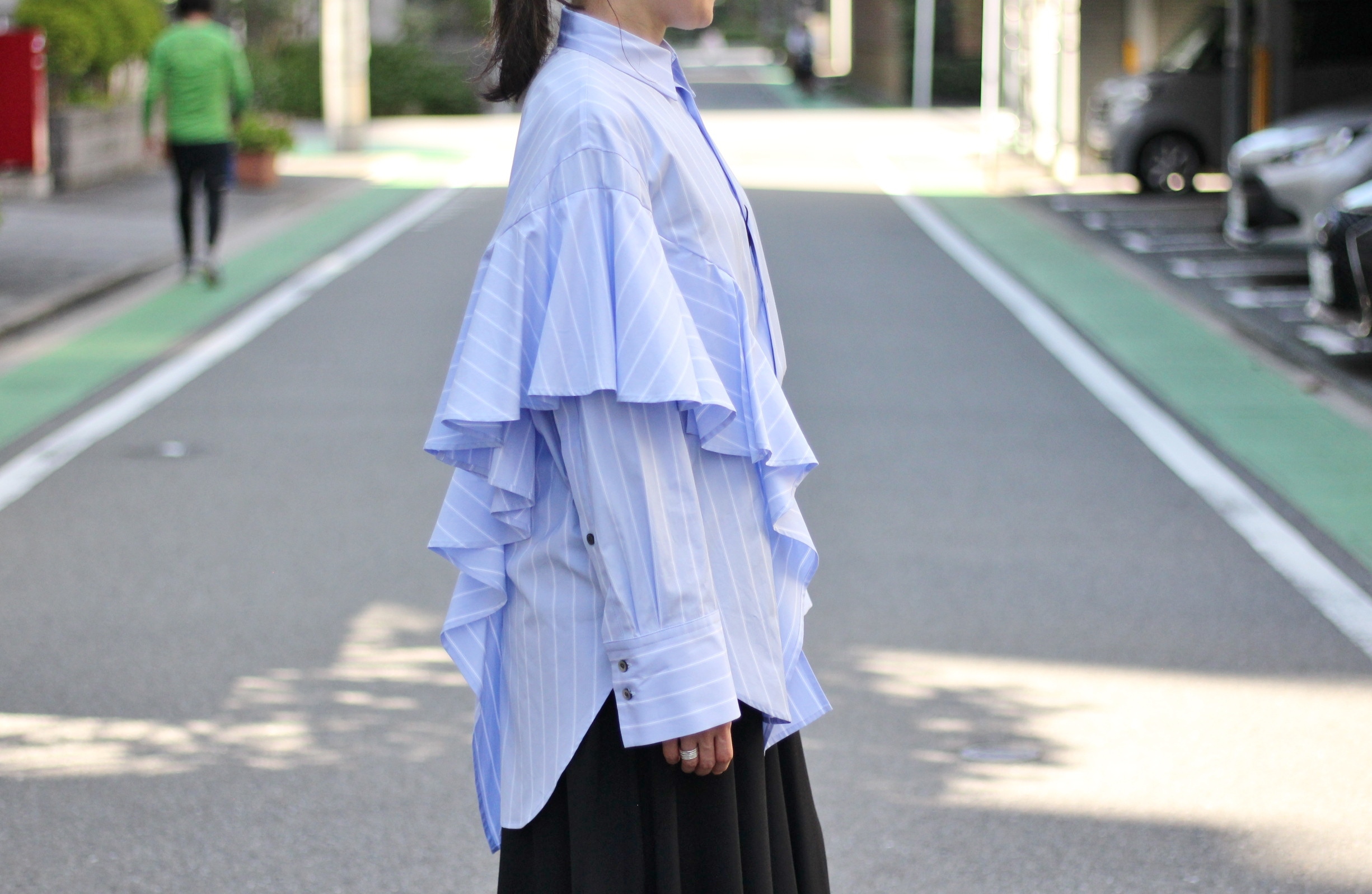 程よいハリ感のある生地のアシンメトリーなフリルストライプシャツ
